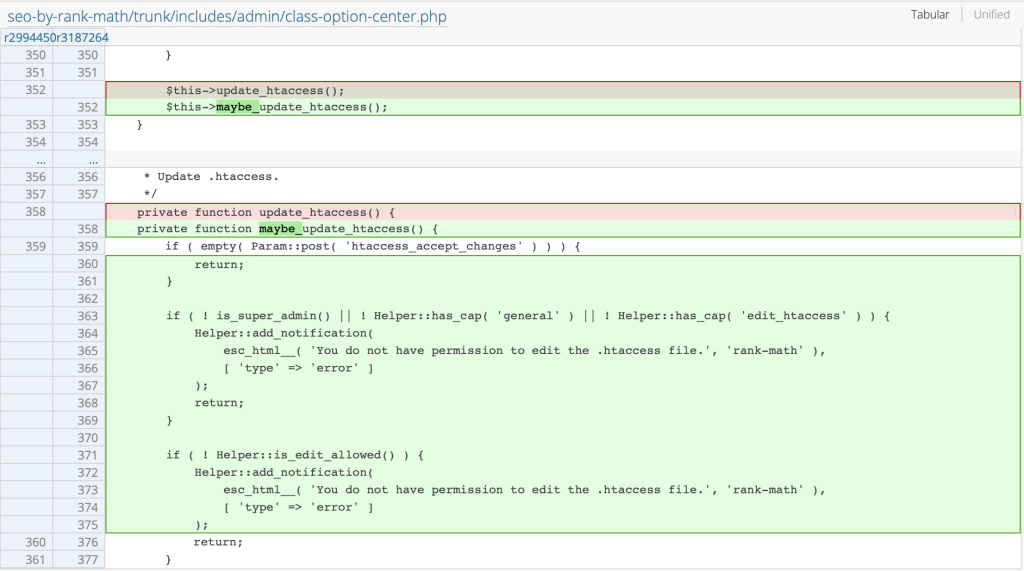 The vulnerability was patched in the version 1.0.232. The vendor patched the issue by adding a proper permission check. In the patched version and onwards, the user now has to be a super-admin in a multisite instance, and has to have a ‘general‘ and ‘edit_htaccess‘ capability to update the .htaccess file. Even if all the above conditions are fulfilled, there is a check that only allows updating the file if it has not been disallowed in the config through the Helper::is_edit_allowed() function as seen in this changeset.