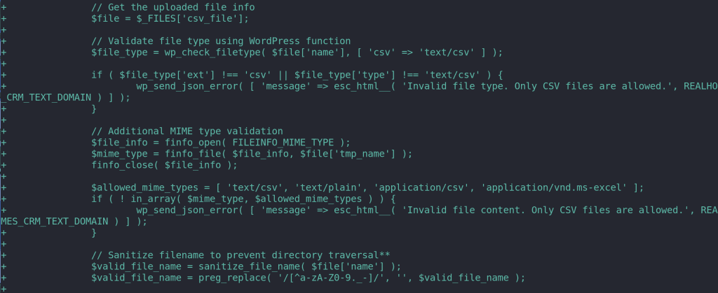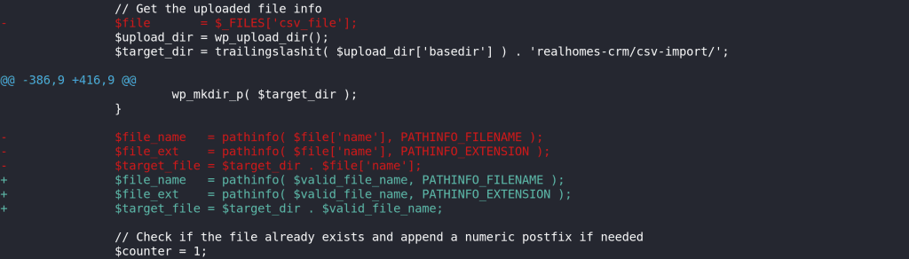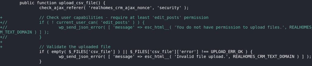 Second, there is no proper permission check on the function, which allows users to just supply arbitrary files via $_FILES[‘csv_file’]. Lastly, the function didn’t have a proper file type and name check, and will directly upload the file via move_uploaded_file to the server.