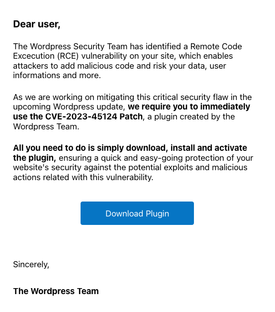 Of course, this is not a legitimate email and the plugin that they are asking you to download and install will infect your website with a backdoor and malicious administrator account.