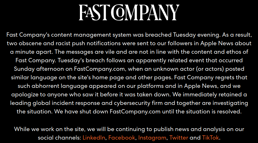Apple News immediately revoked FastCompany.com’s access to post stories when the obscene posts were made. FastCompany took the website offline as well, and it has stayed offline since September 28th to prevent further defacement or defamatory comments to be made on the website. A third-party security contractor has been contracted to perform the incident response, the goal here is to identify for themselves how the attacker(s) got into the website, what data the attacker(s) accessed, what actions the attacker(s) performed, and what further action needs to be performed to secure the site. This is the purpose of proper incident response, they aren’t just cleaning up malware or revoking access, FastCompany is doing all the right things here and it may take some time.