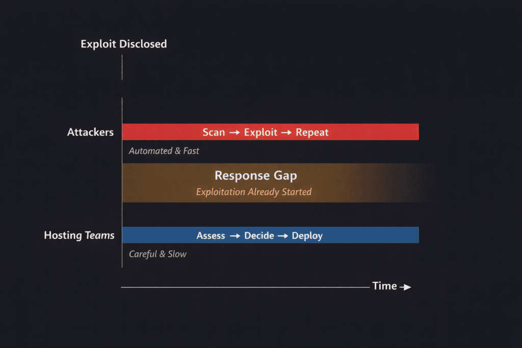 Hosting teams must assess exposure, decide what to block and roll out mitigations carefully to avoid breaking sites. By the time response is in place, exploitation has often already started. This response gap is where most of the damage happens.