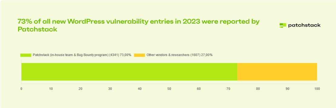 In 2023 Patchstack contributed to 73% of all new vulnerabilities found in the WordPress ecosystem (individual vulnerability entries). In terms of CVEs, Patchstack was responsible for 54% of new CVE IDs in 2023, according to statistics from cvedetails.com.