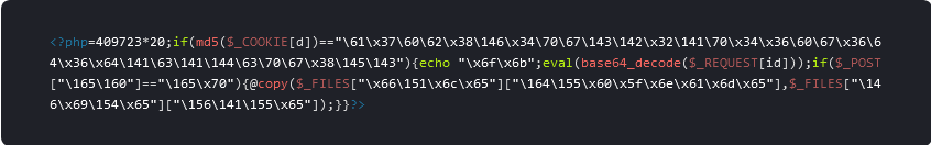 The backdoor most commonly uploaded to infected websites was found in randomly named files like 5069291a69e3.php and contained the following code: