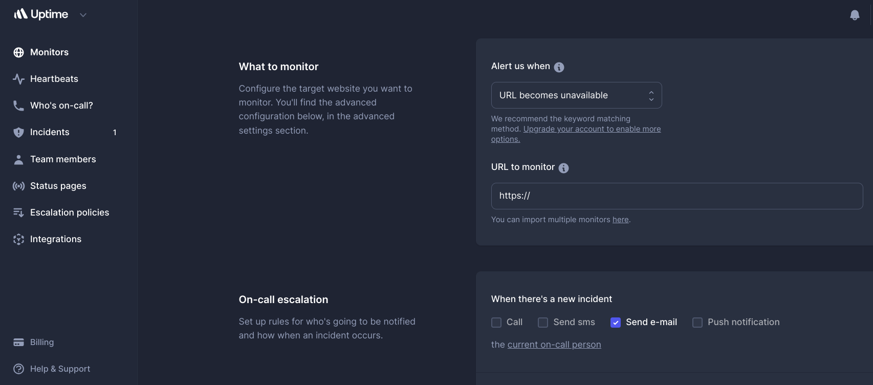 After creating an account, log in to your dashboard to create your first monitor. When setting up monitoring for your website within the dashboard, you’ll come across different alert options. In most cases, it’s advisable to opt for the “Becomes Unavailable” alert type. This selection ensures that you receive notifications whenever your website is no longer accessible.