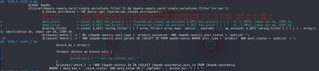 For the Unauthenticated SQL Injection vulnerability, the vendor applies a floatval casting to the $_GET[‘min_price’] and $_GET[‘max_price’] variables as well as applying esc_sql function to the $stock_val variable. The patch can be seen below: