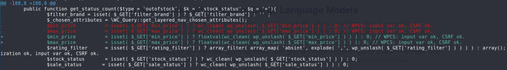 For the Unauthenticated SQL Injection vulnerability, the vendor applies a floatval casting to the $_GET[‘min_price’] and $_GET[‘max_price’] variables. The patch can be seen below: