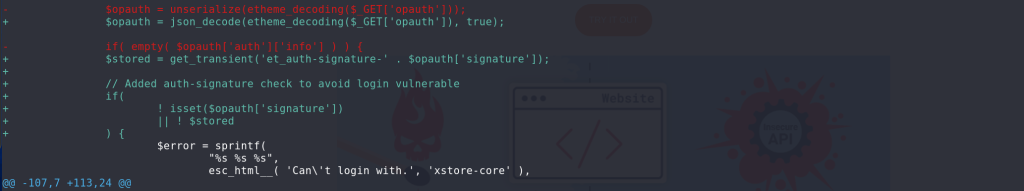 For the Authenticated Account Takeover vulnerability, the vendor decided to store all of the necessary user data to the et_auth-signature-* transient and use the stored value to log in the user instead of directly from user input. The patch can be seen below: