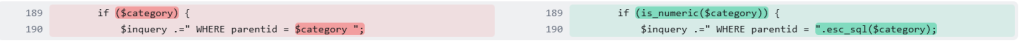 In version 2.3.3, the vendor patched the SQL injection by ensuring that $category is numeric and added additional esc_sql() check on the variable.