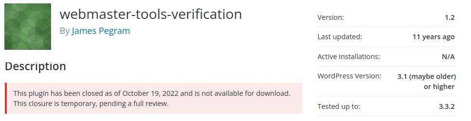 This post will review the webmaster-tools-verification plugin. This plugin was first created in 2009 and is extremely simple consisting of just 4 files: 1 PHP, 1 CSS, 1 image (png), and a readme.txt file. The developer’s last commit was made in 2013.