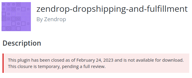 Finally, the two unpatched vulnerabilities with details released this week affected the same plugin: ZenDrop Global Drop Shipping. This plugin was closed on February 24th likely due to these issues.
