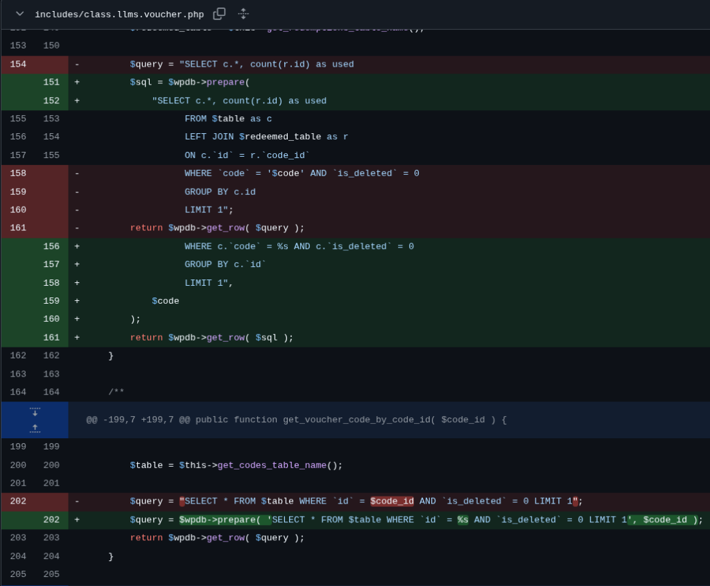 The developer decided to use a proper prepared statement to the affected variables to prevent SQL Injection. The patch can be seen in the below diff image: