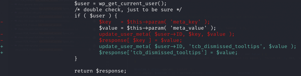 The function intends to dismiss a popup tooltip for the current user. Unfortunately, it allows users to arbitrarily set the meta key and value passed to the update_user_meta function. This condition could lead to a privilege escalation since the user can modify their wp_capabilities meta which contains the user’s role definition.