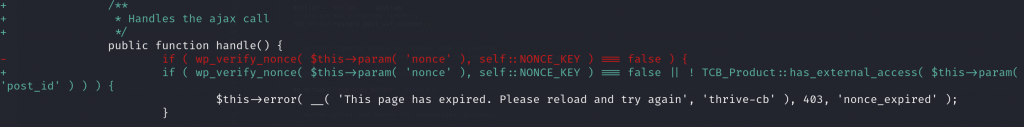 Additionally, to prevent lower-role users from accessing the editor Ajax action, the vendor decided to add access control to the handle function using the has_external_access function. The patch can be seen below :