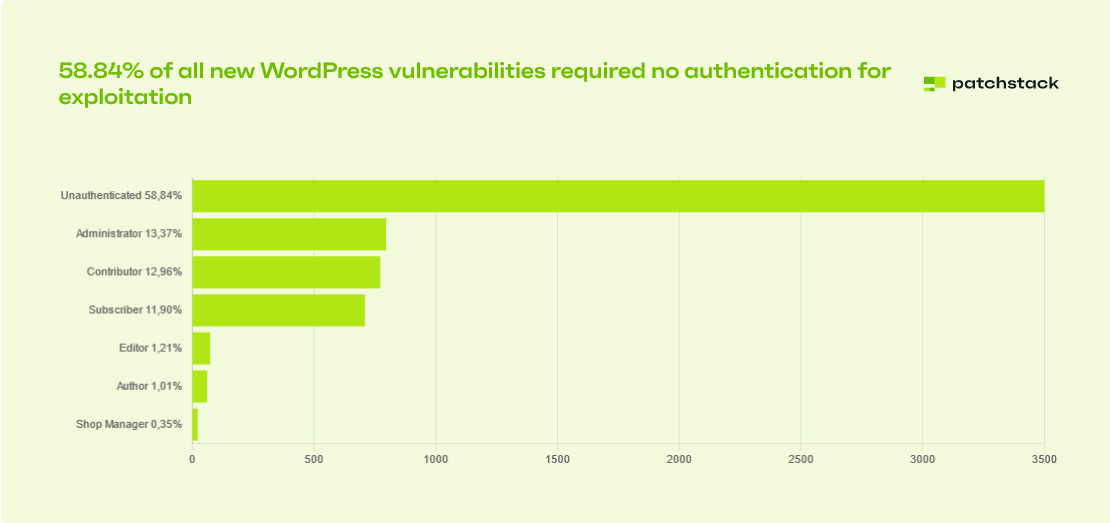 This is not surprising. In our state of WordPress security report, we highlighted that nearly 42% of WordPress sites have at least one vulnerable software component. That means almost half of all WordPress sites risk being hacked due to outdated or insecure plugins. This is very concerning as more than half of the vulnerabilities don’t require any kind of authentication.