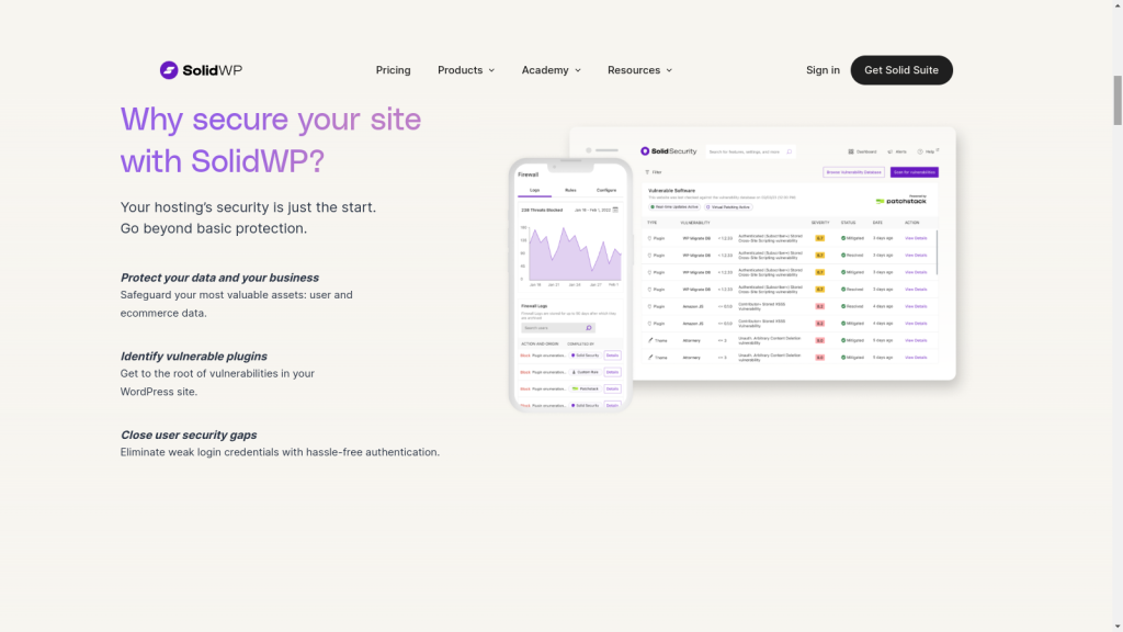 Target audience: Solid Security is ideal for developers who want a one-stop solution for all their WordPress security needs. It’s recommended for people who want the vulnerability management features of Patchstack but also want to take advantage of other SolidWP tools.